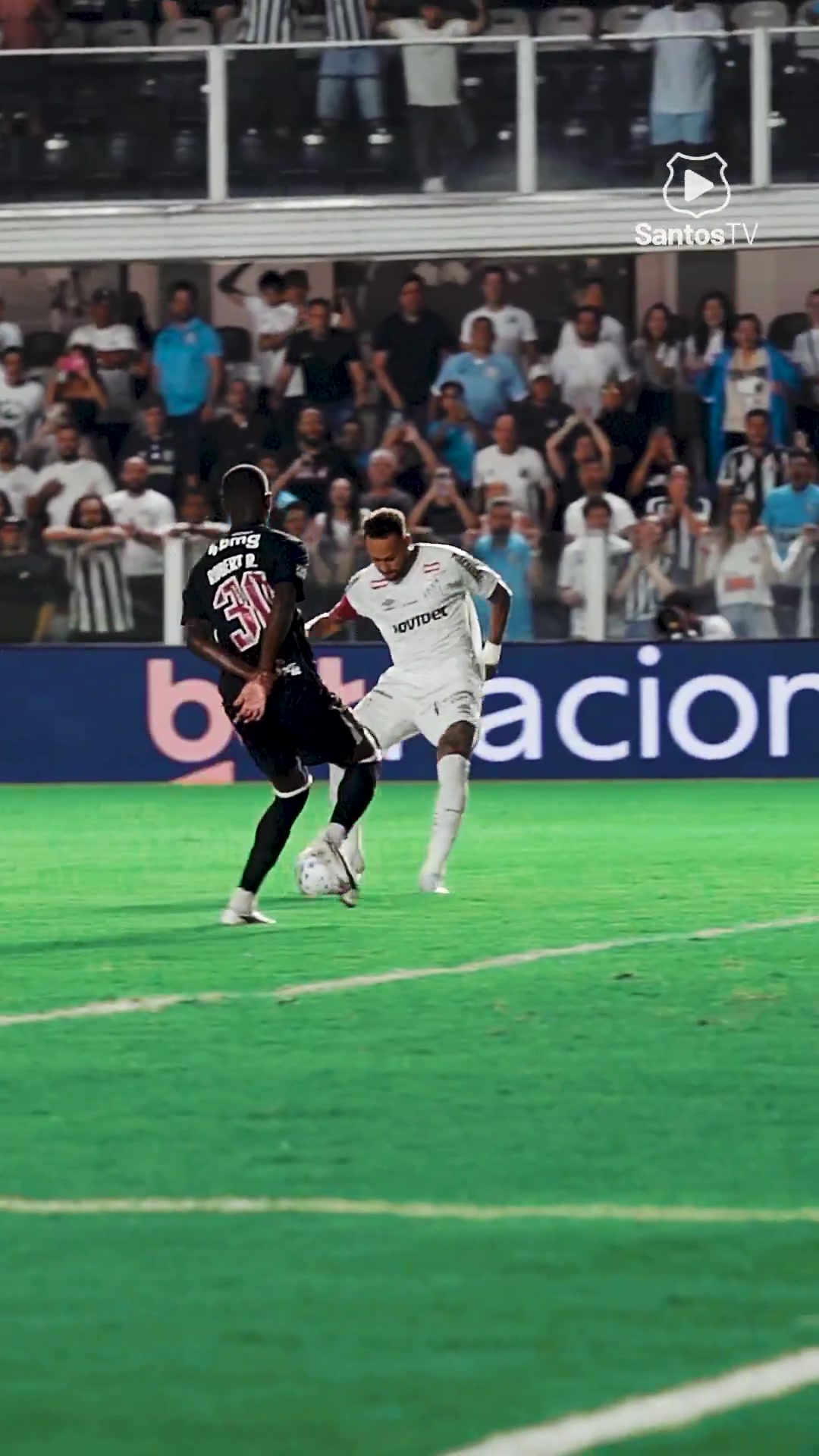 比赛第25分钟,内马尔小角度推远角得手,随后做闭嘴手势+模仿维尼修斯在角旗杆旁跳舞庆祝;比赛第61分钟,内马尔挑射破门完成梅开二度,最终帮助桑托斯2-1取胜。
